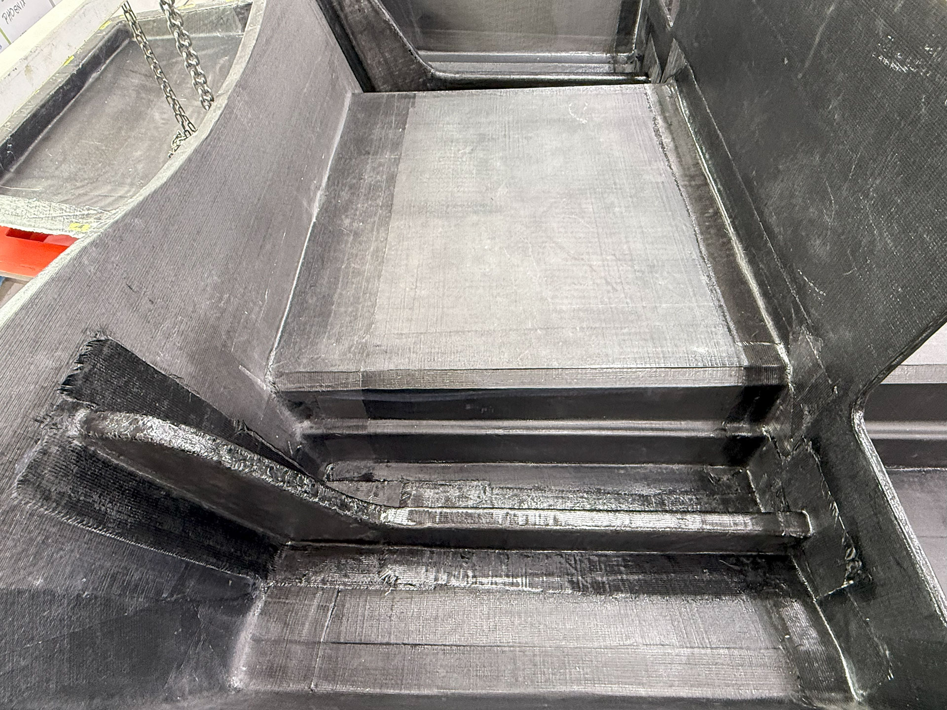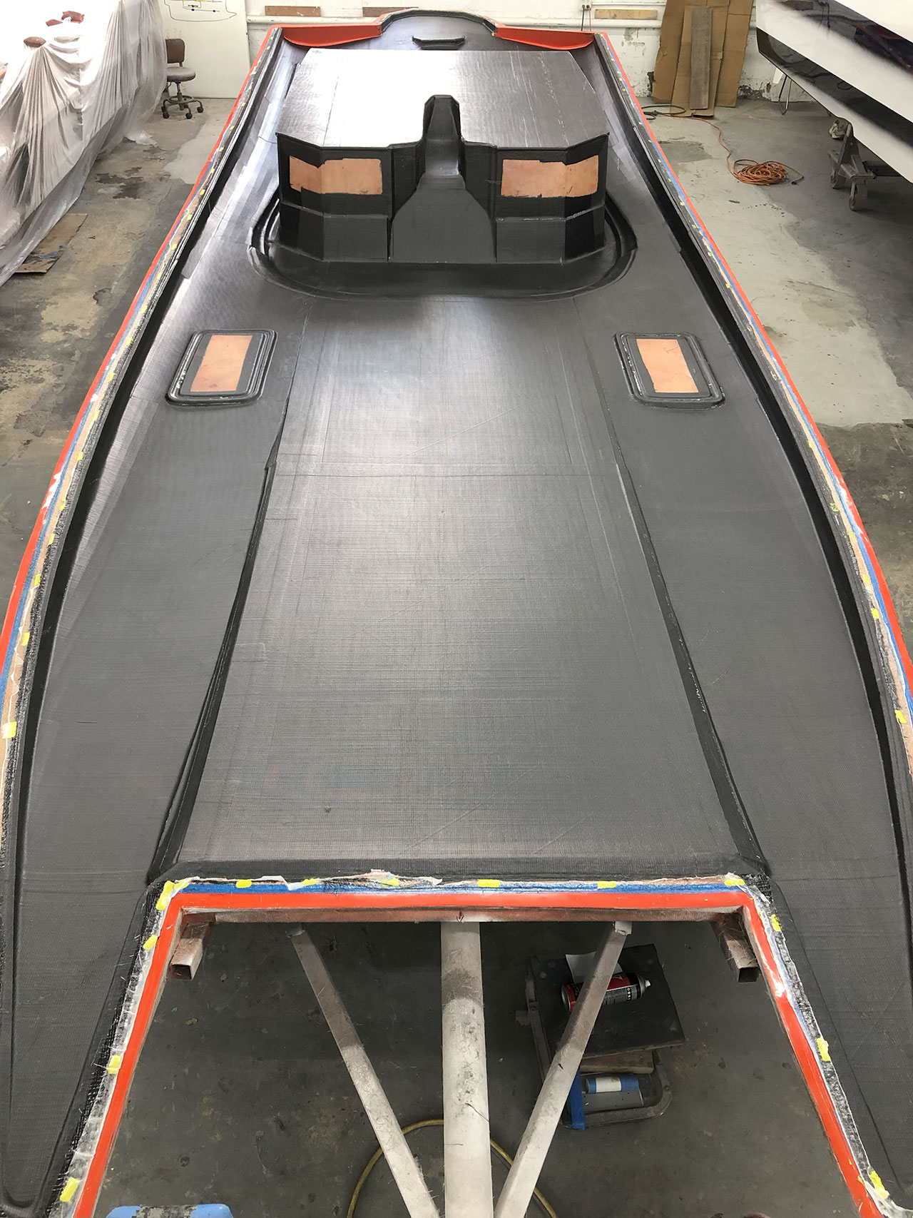 Smart Performance Marine hulls are made entirely with epoxy resin and then post-cured in the mold for still greater tensile strength. Post-curing means, in the simplest sense, “cooking” the entire hull inside thermal blankets using a massive heater. The hull is held at a specific temperature for six to eight hours, then allowed to cool naturally, effectively curing the laminate a second time while also saving time in the mold.
